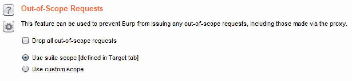- Out-of-Scope Requests: It provides rules to Burp regarding Out-of-Scope Requests. Usually, the default setting of Use suite scope [defined in Target tab] is most commonly used:
