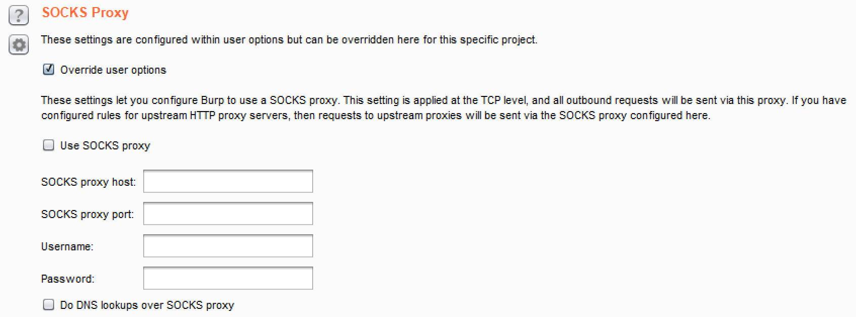 - SOCKS Proxy: It provides an override button in the event the tester wishes for Project options related to the SOCKS Proxy configuration used against the target application to supersede any SOCKS Proxy settings within the user options.
