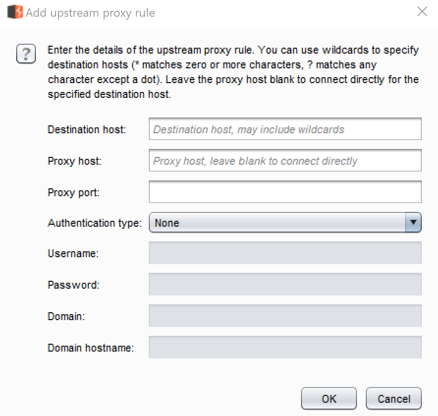 After clicking the checkbox to override the user's options, the tester is presented with a table enabling upstream proxy options specific to this project. Clicking the Add button displays a pop-up box called Add upstream proxy rule. This rule is specific to the target application's environment. This feature is very helpful if the target application's environment is fronted with a web proxy requiring a different set of credentials than the application login:
