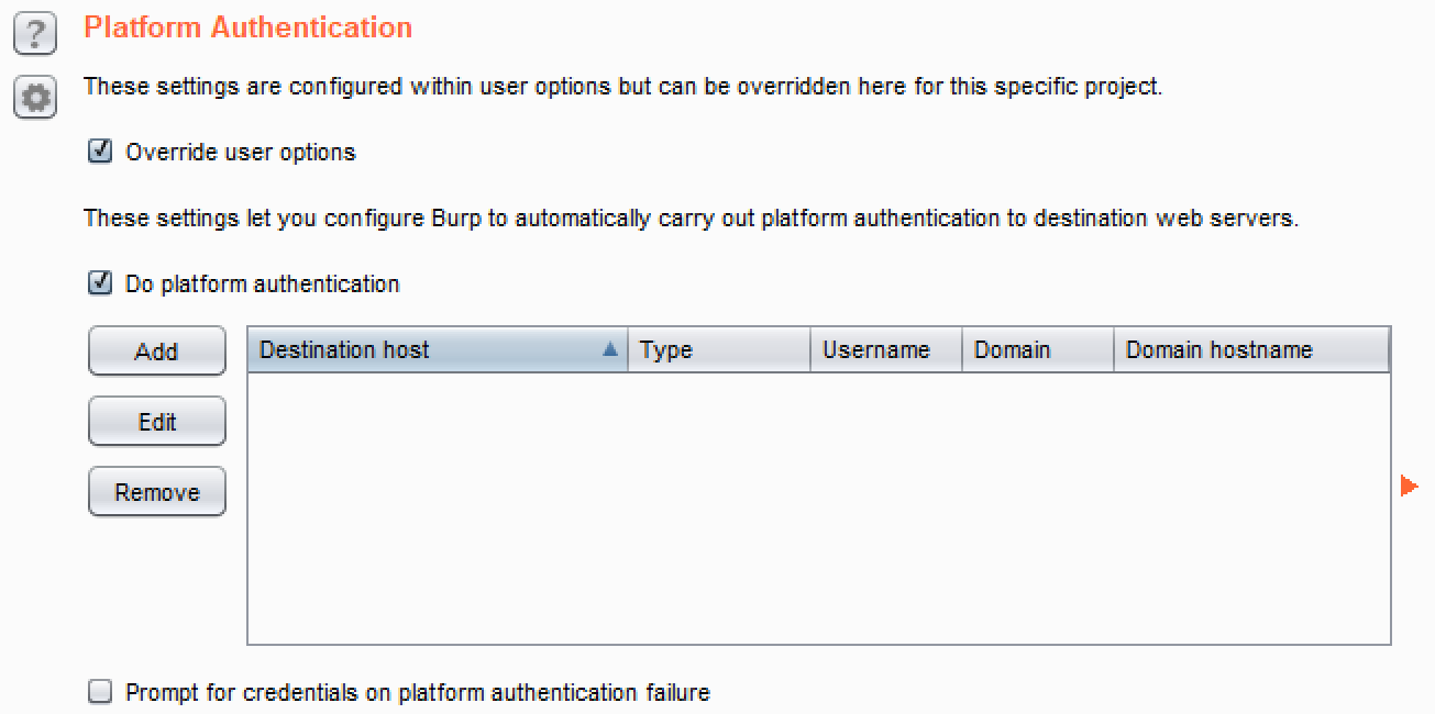 - Platform Authentication: This provides an override button in the event the tester wants the Project options related to the type of authentication used against the target application to supersede any authentication settings within the user options.