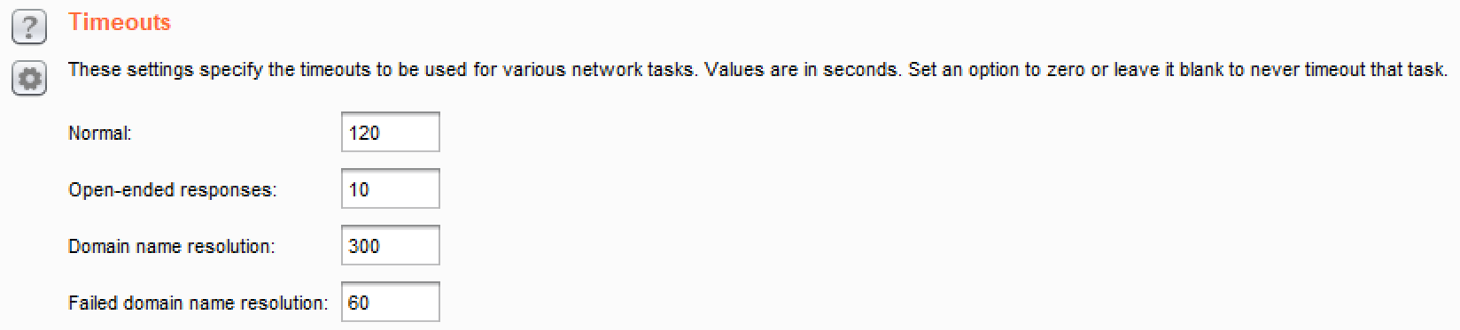 - Timeouts: It allows for timeout settings for different network scenarios, such as failing to resolve a domain name: