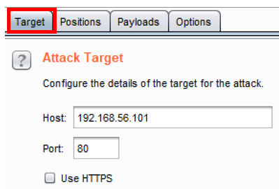 The Intruder Target tab defines your targeted web application. These settings are pre-populated for you by Burp: