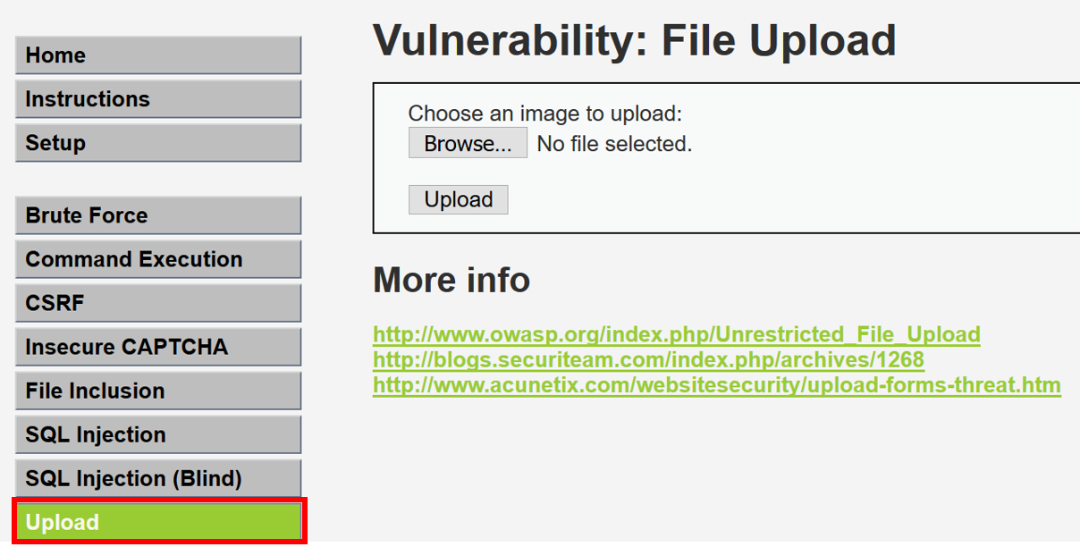 - Ensure the owaspbwa VM is running. Select DVWA from the initial landing page of the VM. The landing page will be configured to an IP address specific to your machine.