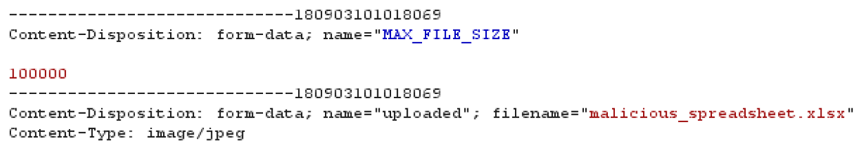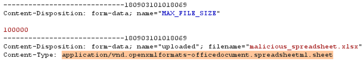 - With the request paused in Burp's Proxy | Interceptor, change the Content-type from application/vnd.openxmlformats-officedocument.spreadsheet.sheet to image/jpeg instead.