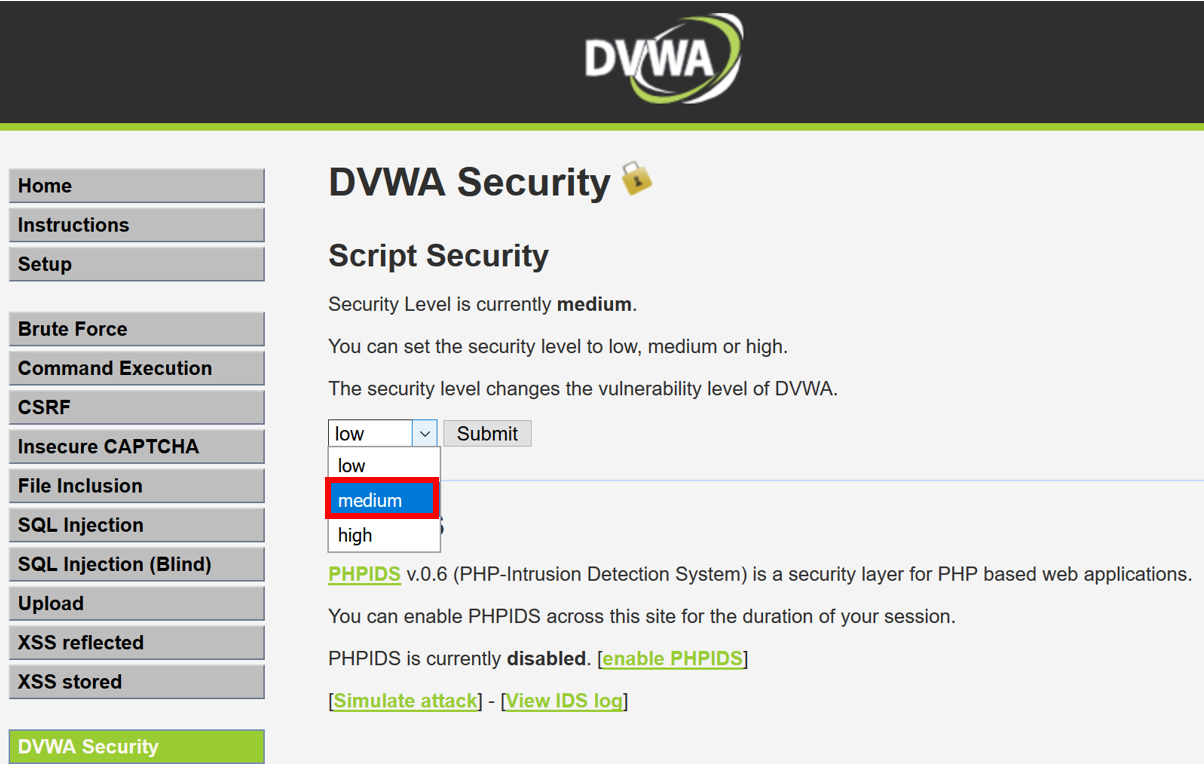 - Select the DVWA Security option from the menu on the left. Change the default setting of low to medium and then click Submit: