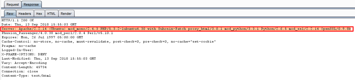 - Switch to the Burp Proxy | HTTP history tab and find the request you just made browsing to the homepage. Click the Response tab. Note the overly verbose Server header indicating the web server type and version along with the operating system and programming language used. This information can be used by an attacker to fingerprint the technology stack and identify vulnerabilities that can be exploited: