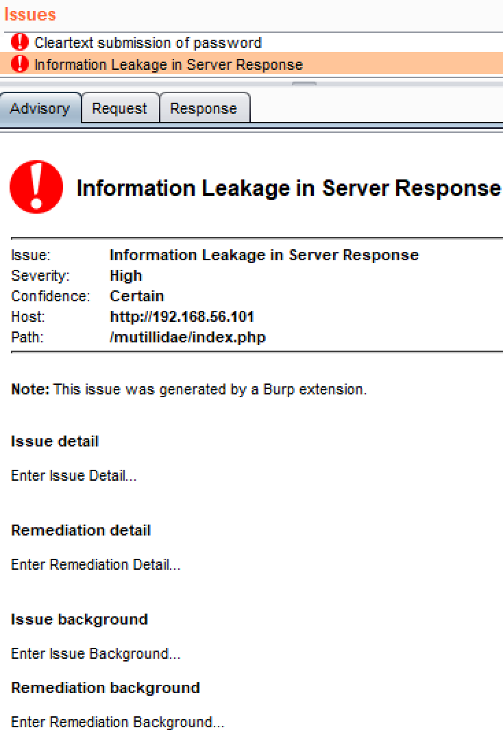 - A pop-up dialog box appears. Within the General tab, we can create a new issue name of Information Leakage in Server Response. Obviously, you may add more verbiage around the issue detail, background, and remediation areas, as follows: