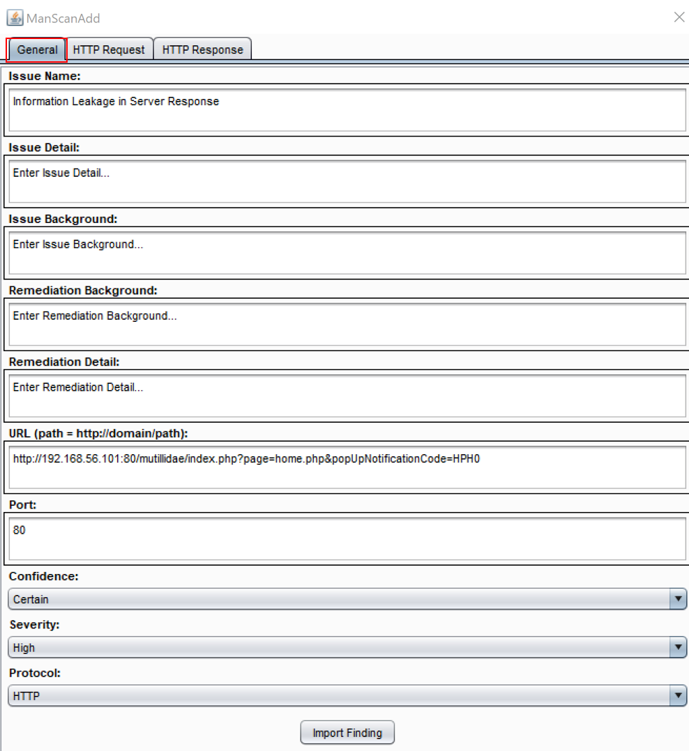 - Once completed, flip back to the General tab and click the Import Finding button. You should see the newly-created scan issue added to the Issues window, as follows:
