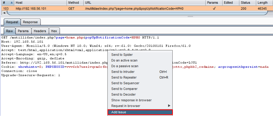 - Since this is a finding, we need to create a new issue manually to capture it for our report. While viewing the Request, right-click and select Add Issue, as follows: