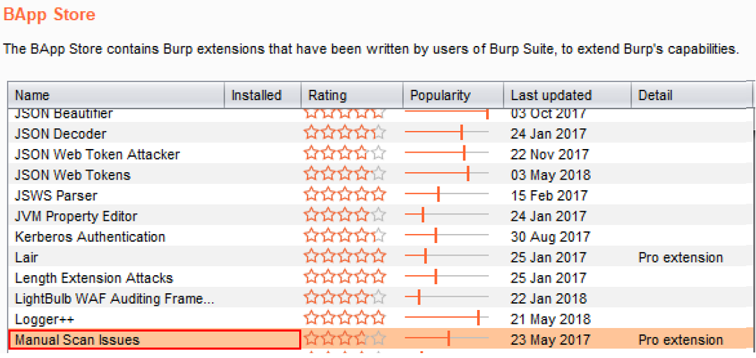 - Switch to the Burp Extender tab. Go to the BApp Store and find the plugin labeled Manual Scan Issues. Click the Install button: