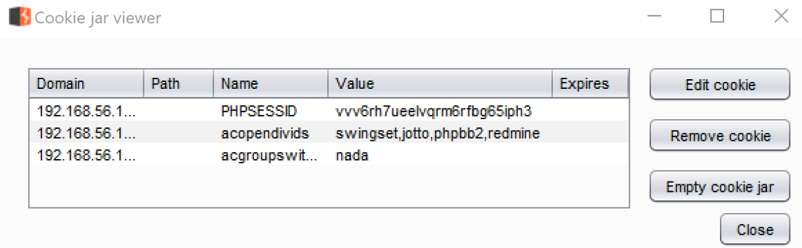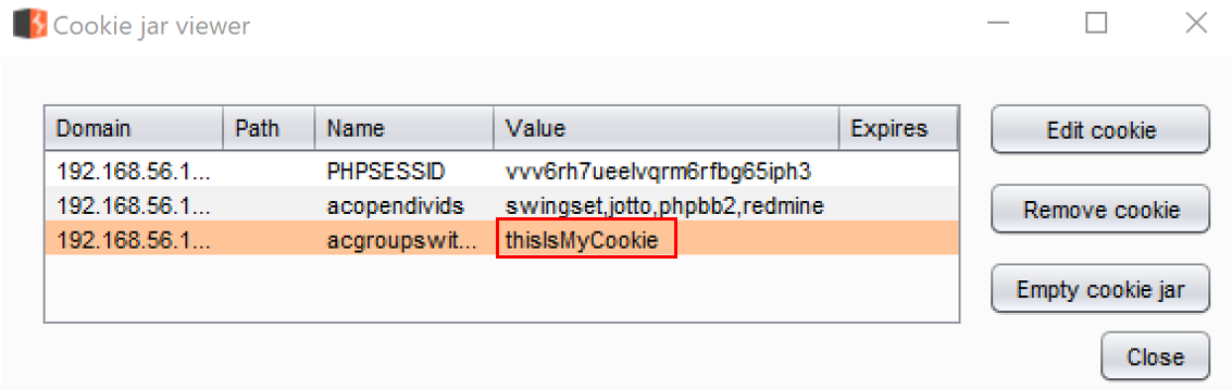 - Return to the Burp Cookie Jar. You now have three cookies available. Each cookie has a Domain, Path, Name, and Value identified, as follows: