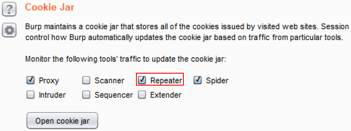 - The default scope for the Burp Cookie Jar is Proxy and Spider. However, you may expand the scope to include other tools. Click the checkbox for Repeater, as follows: