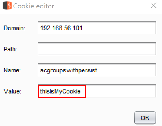- Select the last cookie in the list and click the Edit cookie button. Modify the value from nada to thisIsMyCookie and then click OK, as follows: