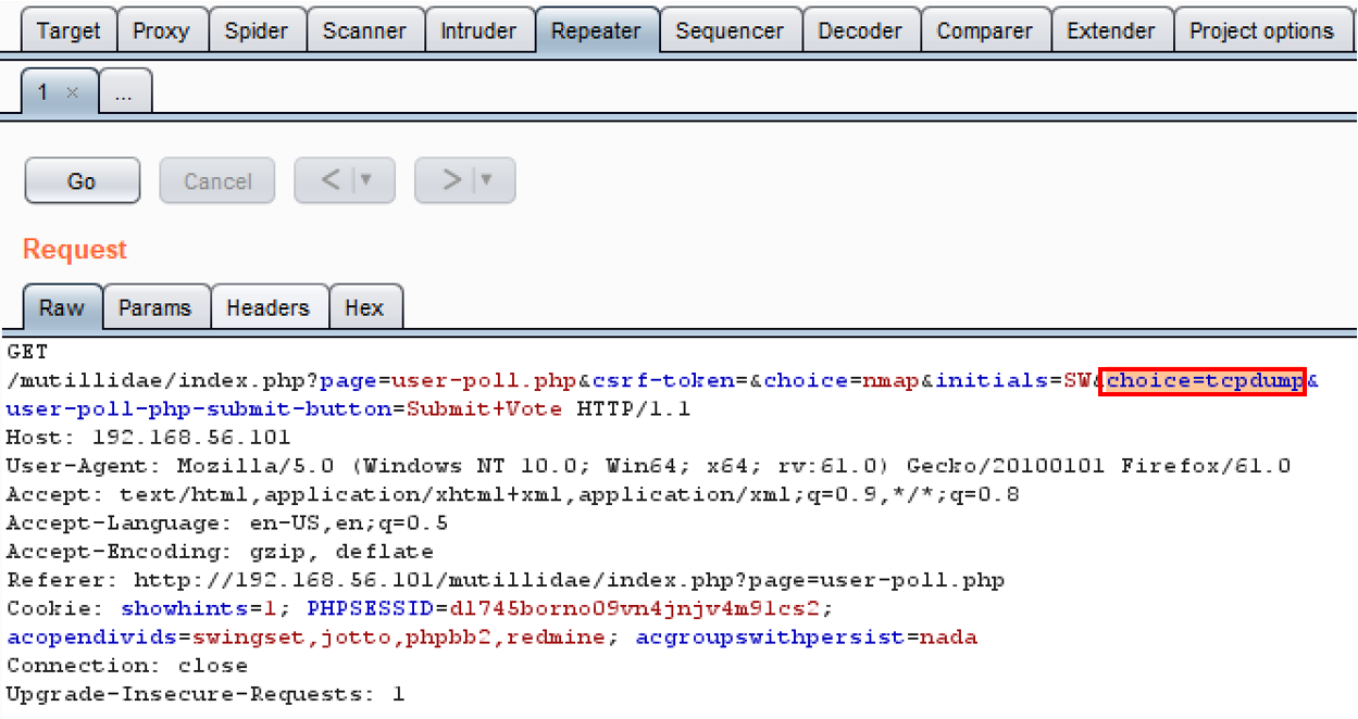 - Switch to the Burp Repeater and add another parameter with the same name to the query string. Let's pick another tool from the User Poll list and append it to the query string, for example, “&choice=tcpdump”. Click Go to send the request: