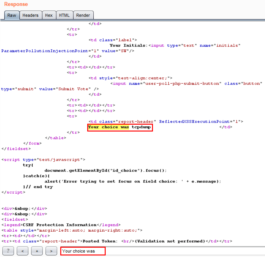 - Examine the response. Which choice did the application code accept? This is easy to find by searching for the Your choice was string. Clearly, the duplicate choice parameter value is the one the application code accepted to count in the User Poll vote: