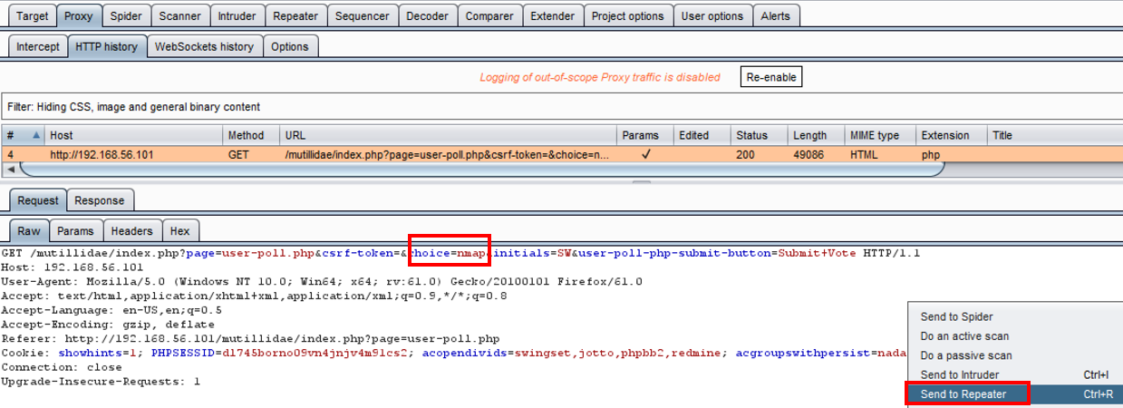 - Switch to the Burp Proxy | HTTP history tab, and find the request you just performed from the User Poll page. Note the parameter named choice. The value of this parameter is Nmap. Right-click and send this request to Repeater:
