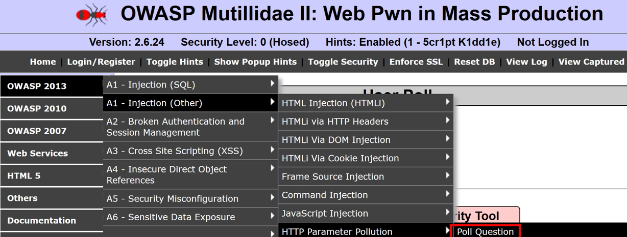 - From the OWASP Mutilliae II menu, select Login by navigating to OWASP 2013 | A1 - Injection (Other) | HTTP Parameter Pollution | Poll Question:
