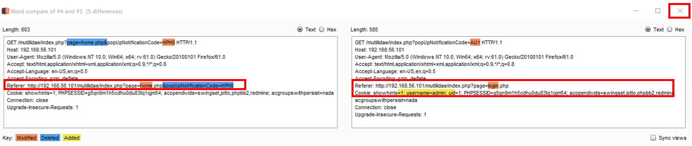- A dialog pop-up displays the two requests with color-coded highlights to draw your eyes to the differences. Note the changes in the Referer header and the additional name/value pair placed in the admin account cookie. Close the pop-up box with the X on the right-hand side: