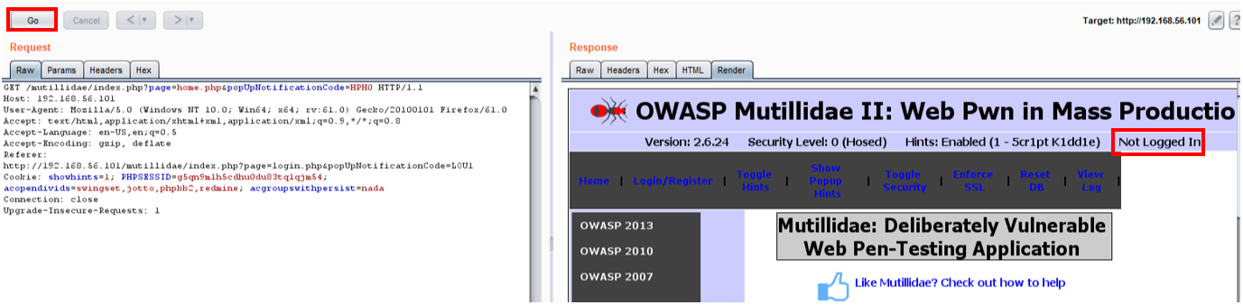 - Click the Go button to send your modified GET request. Remember, this is the first GET request you performed as unauthenticated.