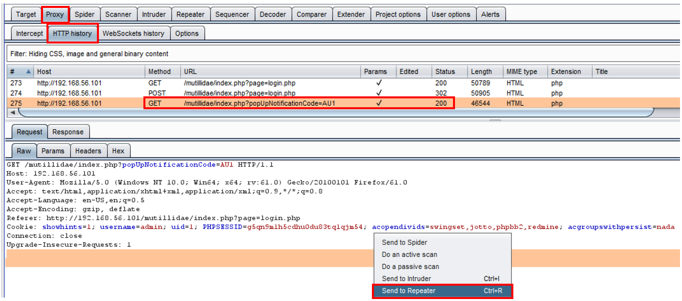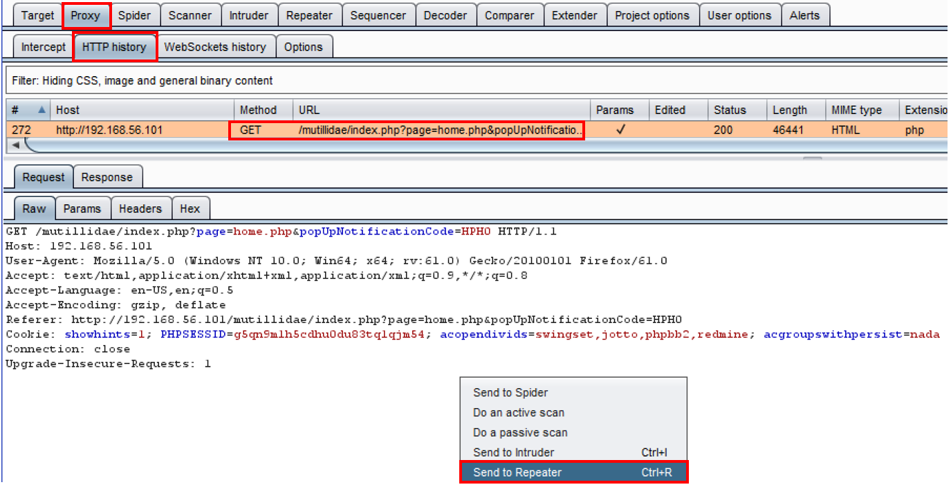 - In Burp, go to the Proxy | HTTP history tab and select the request you just made, browsing to the home page as unauthenticated. Right-click, and then select Send to Repeater:
