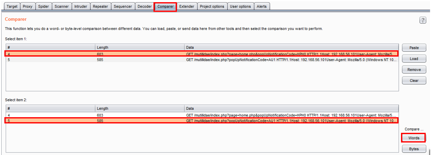 - Go to Burp's Comparer tab. Notice the two requests you sent are highlighted. Press the Words button on the bottom right-hand side, to compare the two requests at the same time:
