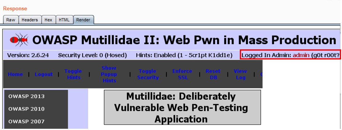 - Verify that you are now logged in as admin in the Response | Render tab. We were able to bypass the authentication mechanism (that is, the log in page) by performing parameter manipulation: