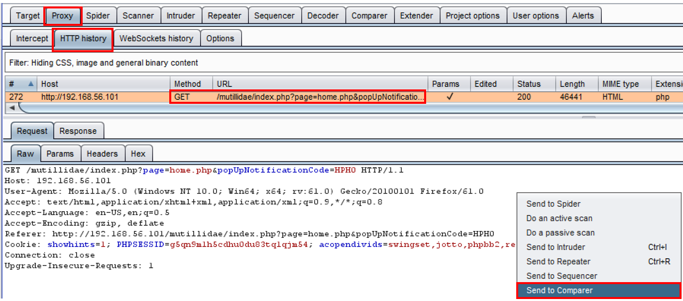 - Using this same request and location, right-click again and Send to Comparer (request):