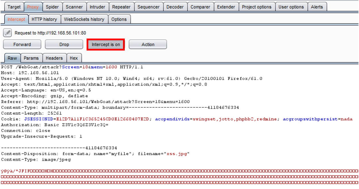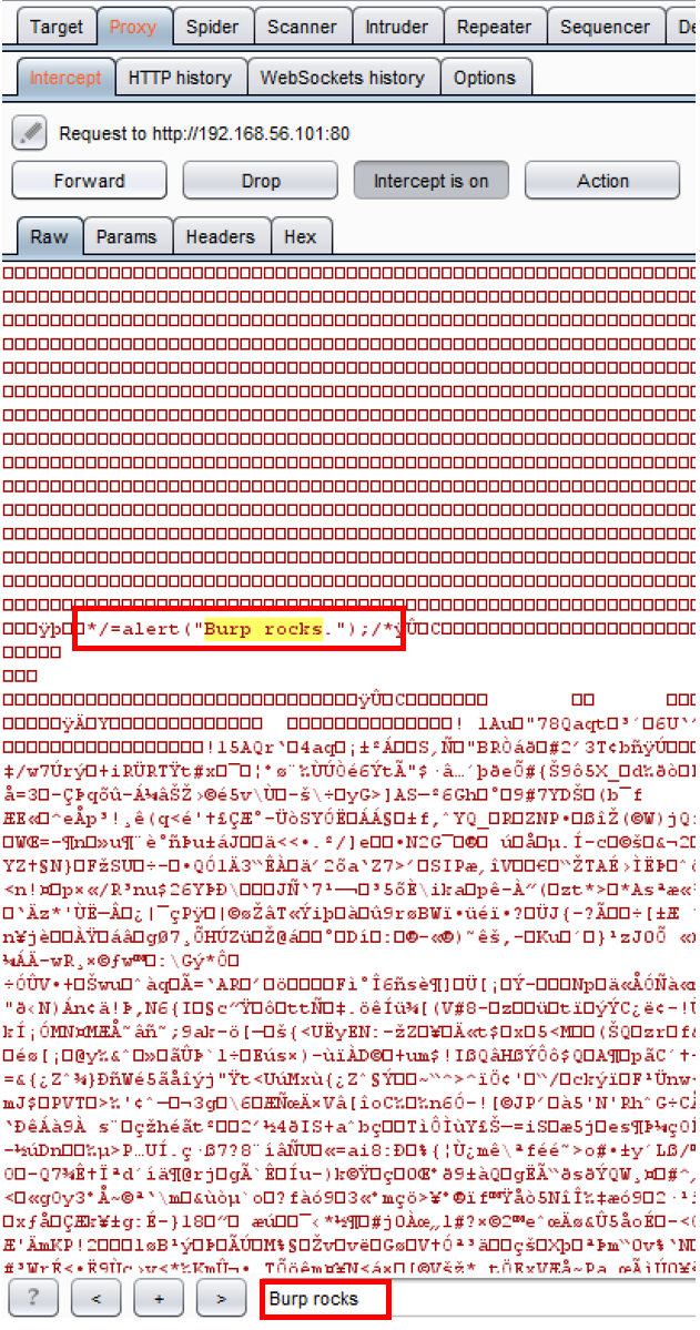 - Within the Intercept window while the request is paused, type Burp rocks into the search box at the bottom. You should see a match in the middle of the image. This is our polyglot payload. It is an image, but it contains a hidden XSS script within the comments of the image: