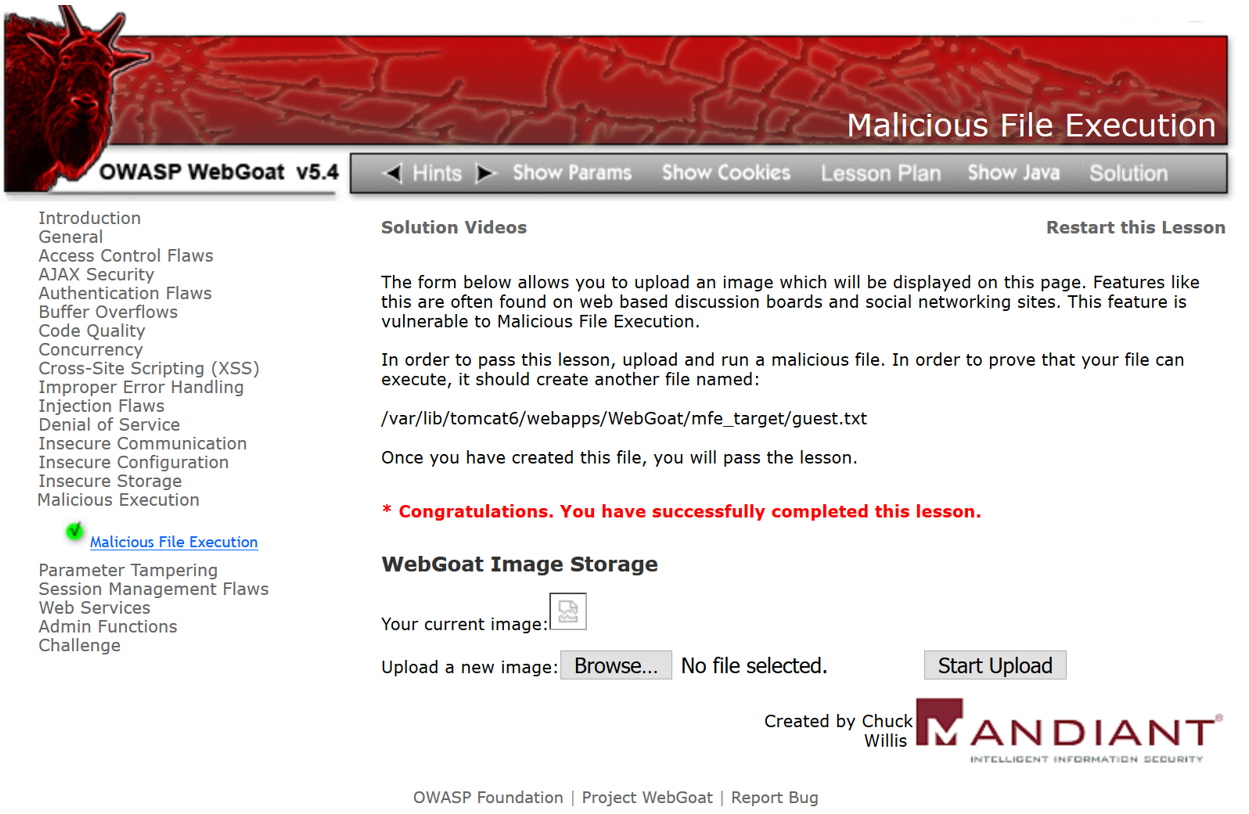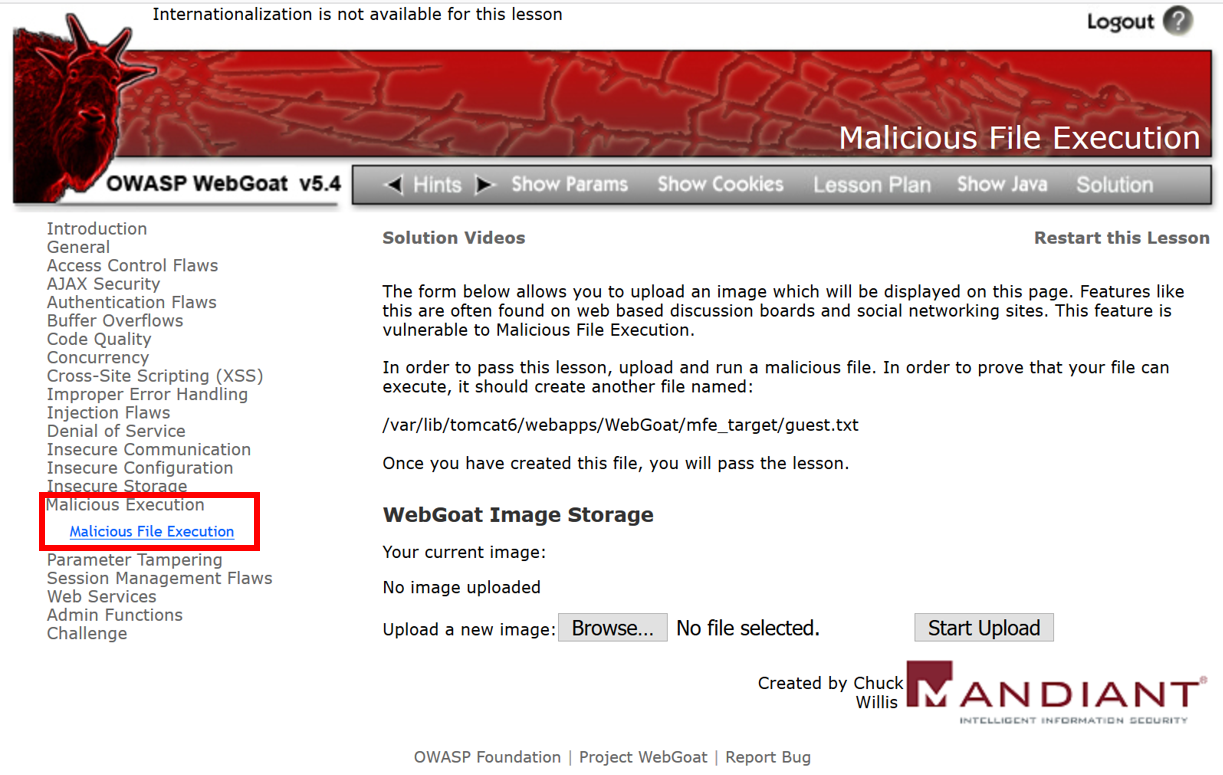 - Click Malicious Execution | Malicious File Execution from the left-hand menu. You are presented with a file upload functionality page. The instructions state that only images are allowed for upload: