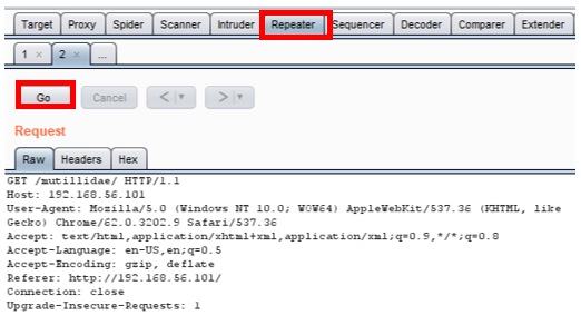 - Switch over to the Repeater tab. Note the HTTP Request is ready for the tester to tweak parameters, and then send the request to the application via the Go button.