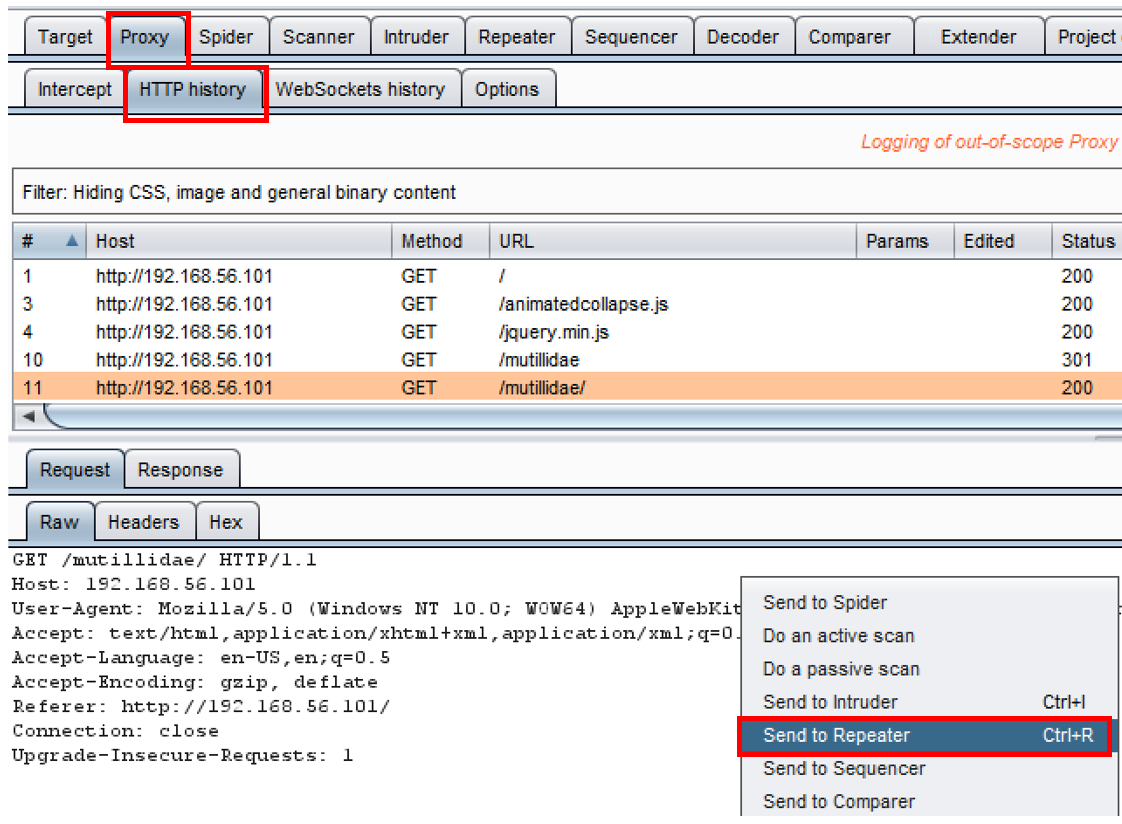- From the Target | Site map or from Proxy | HTTP history tabs (shown in the following screenshot), right-click a message and select Send to Repeater: