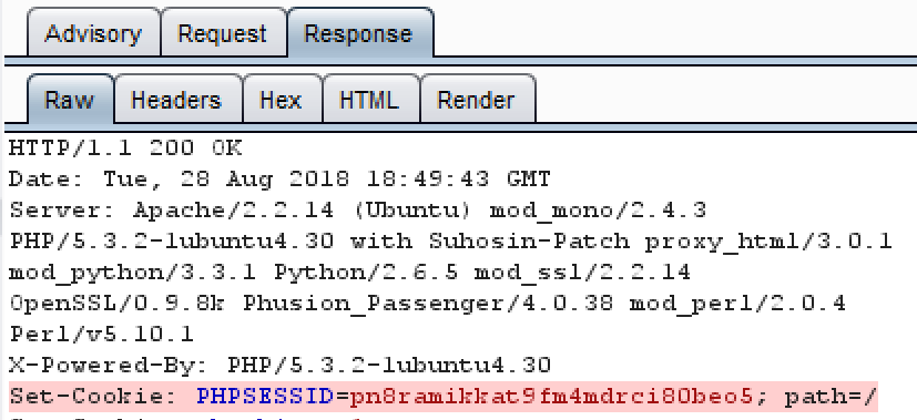 - Look at the Response tab of that message to validate the finding. We can clearly see the PHPSESSID cookie does not have the HttpOnly flag set. Therefore, we can change the severity from Low to High and the confidence level from Firm to Certain:
