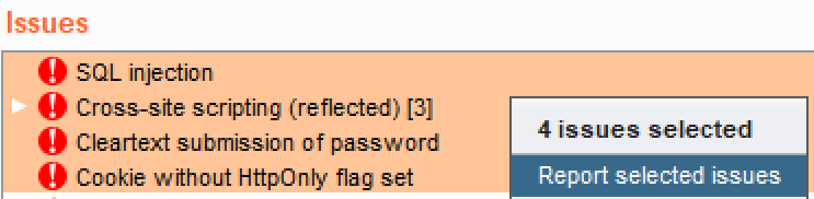 - For this recipe, select the issues with the highest confidence and severity levels to be included in the report. After selecting (highlighting + Shift key) the items shown here, right-click and select Report selected issues: