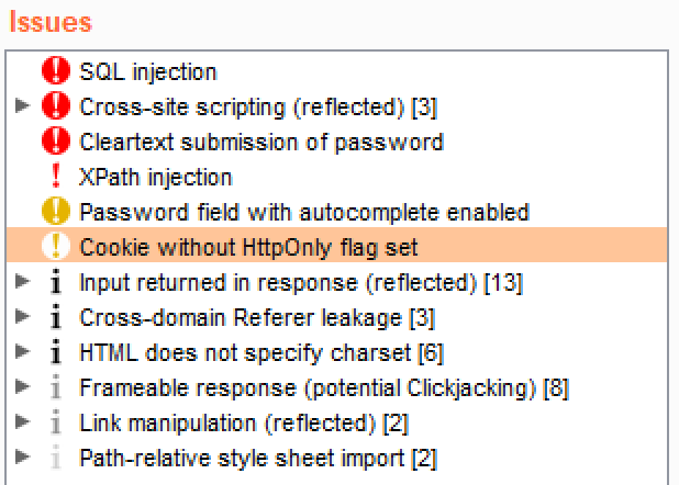 - For this recipe, select Cookie without HttpOnly flag set under the Issues heading:
