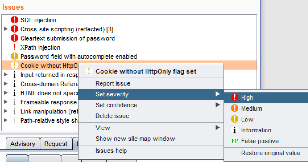 - Right-click the issue and change the severity to High by selecting Set severity | High: