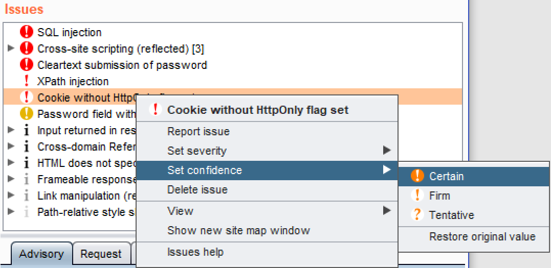 - Right-click the issue and change the severity to Certain by selecting Set confidence | Certain: