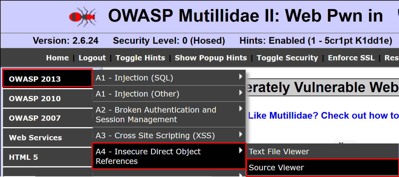 - From the Mutillidae menu, select OWASP 2013 | A4 – Insecure Direct Object References | Source Viewer: