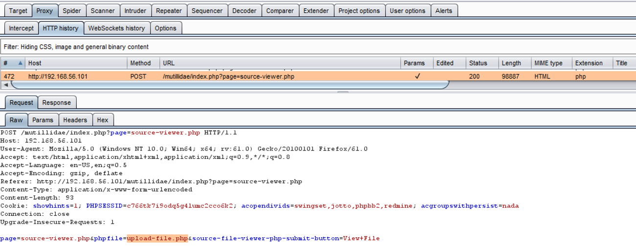 - Switch to Burp's Proxy | HTTP history tab. Find the POST request you just made while viewing the upload-file.php file. Note the phpfile parameter with the value of the file to display. What would happen if we change the value of this parameter to something else?