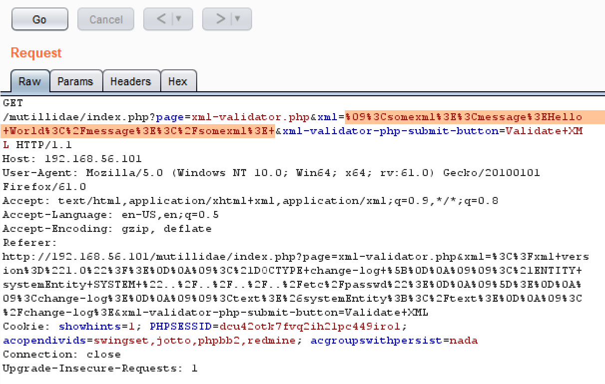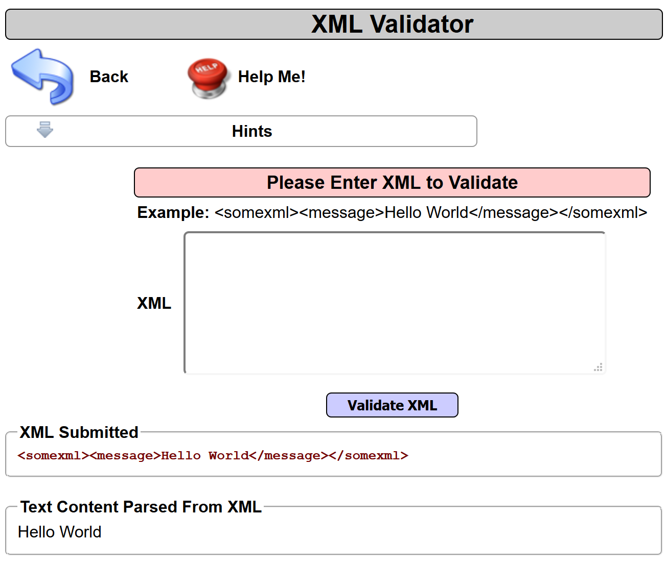 - Navigate to the XML External Entity Injection page, that is, through Others | XML External Entity Injection | XML Validator: