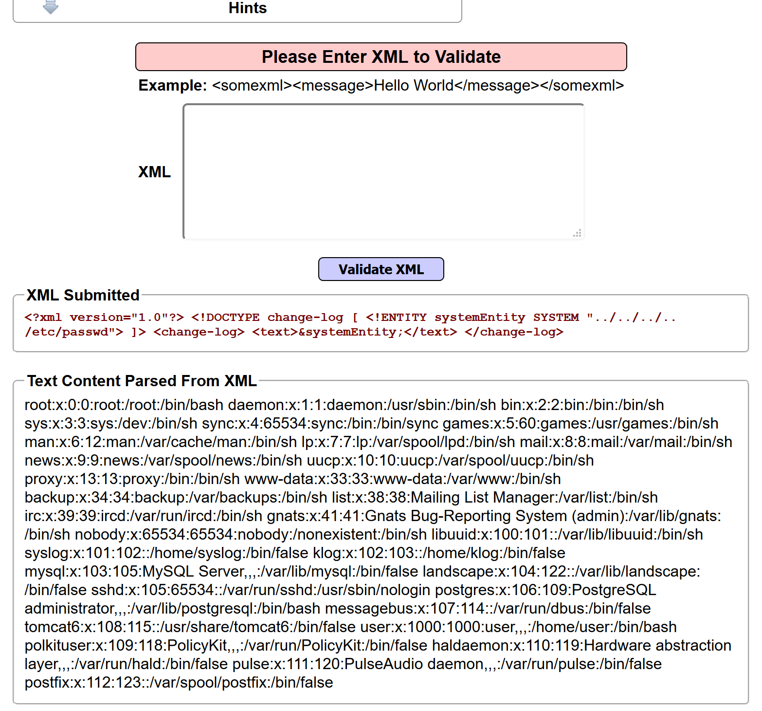 - Note that the returned XML now shows the contents of the /etc/passwd file! The XML parser granted us access to the /etc/passwd file on the operating system: