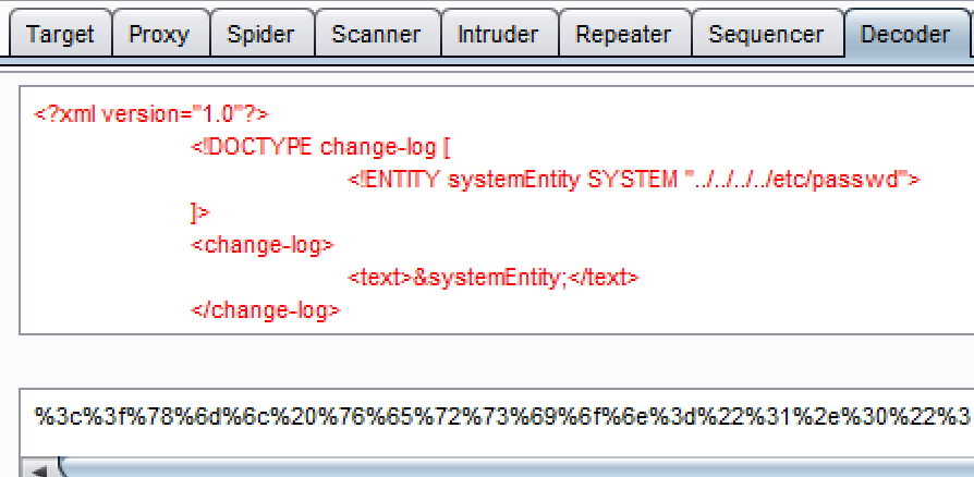 Since there are odd characters and spaces in the new XML message, let's type this payload into the Decoder section and URL-encode it before we paste it into the xml parameter.