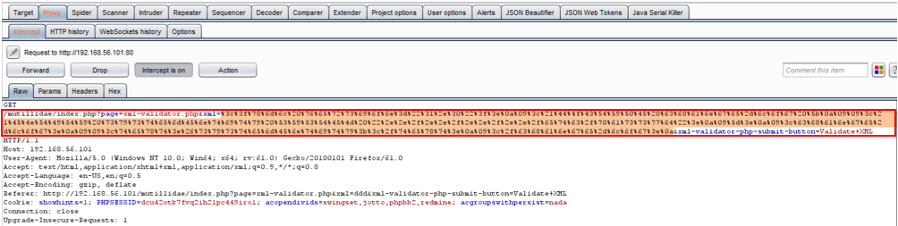 - Return to the Firefox browser and reload the page. As the request is paused, replace the current value of the xml parameter with the new URL-encoded payload: