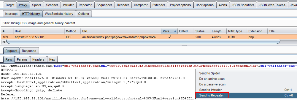 - Switch to Burp Proxy| HTTP history tab and look for the request you just submitted to validate the XML. Right-click and send the request to the repeater: