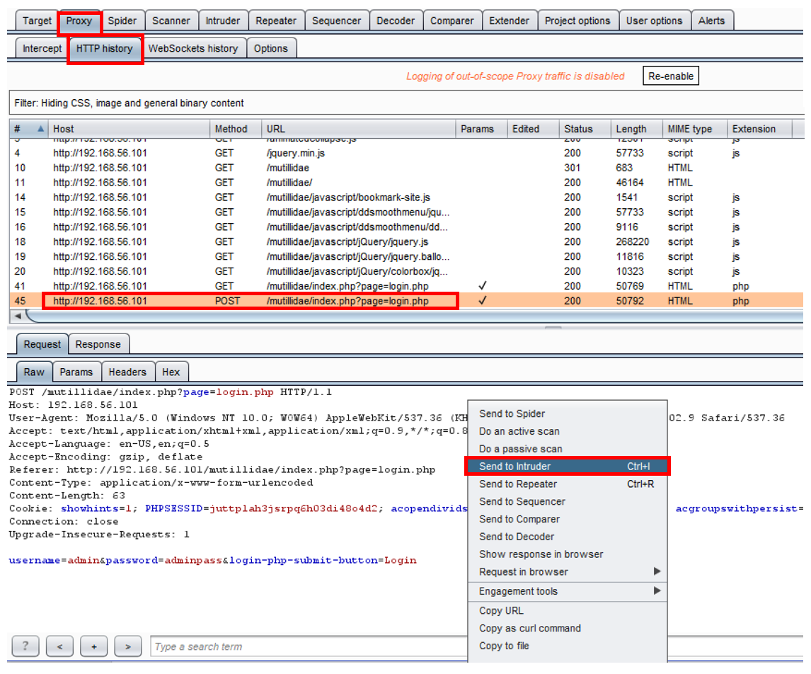 - As the login attempt message is highlighted in the HTTP history table, right-click the Request tab, and select Send to Intruder: