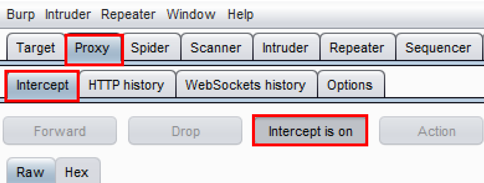 In the following, Proxy | Intercept button is disabled: