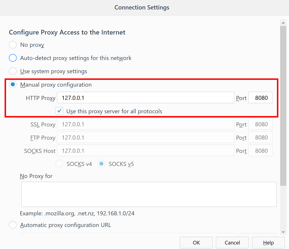 - In the Connection Settings, select Manual proxy configuration and type in the IP address of 127.0.0.1 with port 8080. Select the Use this proxy server for all protocols checkbox: