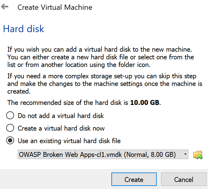 - Use the folder icon on the right to select OWASP Broken Web Apps-cl1.vmdk file from the extracted list and click Create, as follows: